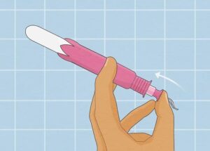 تامپون را با انگشتانی که با آن می نویسید نگه دارید. اپلیکاتور دارای یک دستگیره برآمدگی در بالای لوله بیرونی خود است، جایی که به پیستون باریکتر متصل می شود. آن را با انگشت میانی و شست خود در آنجا نگه دارید و انگشت اشاره خود را در بالای پیستون قرار دهید.
